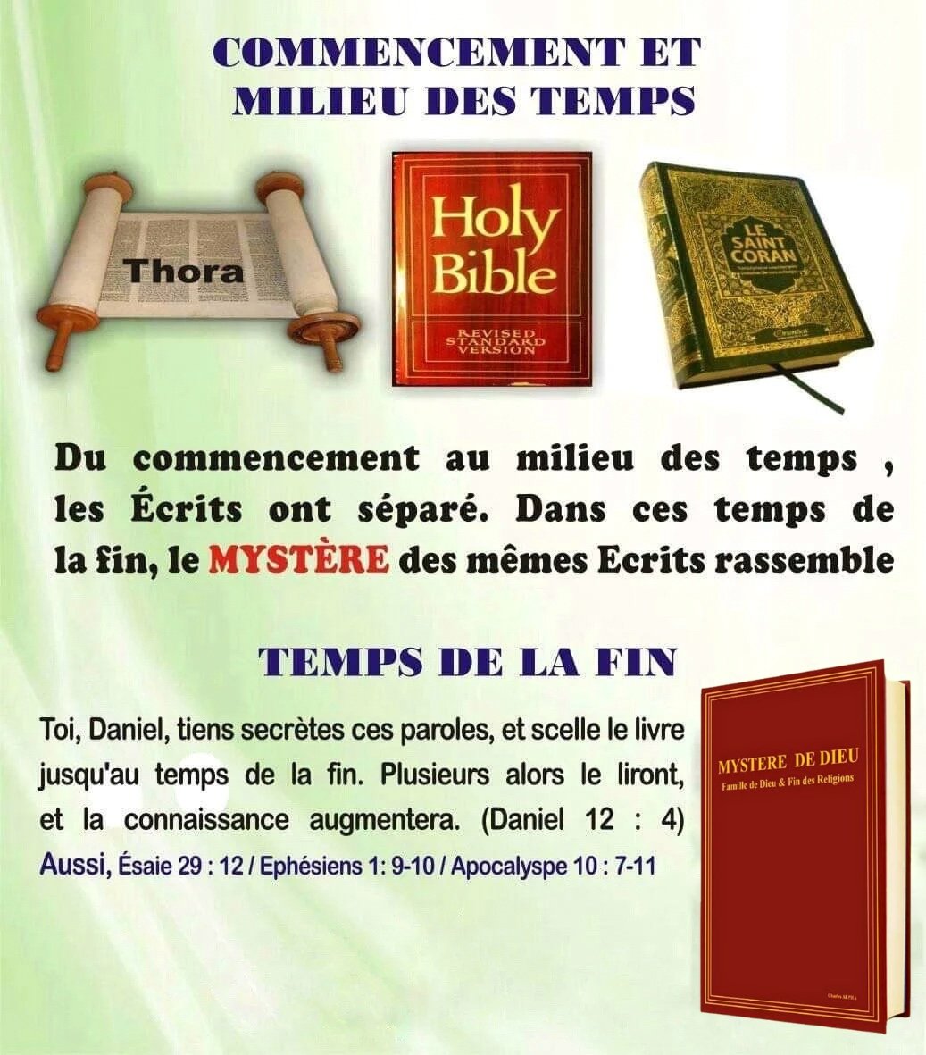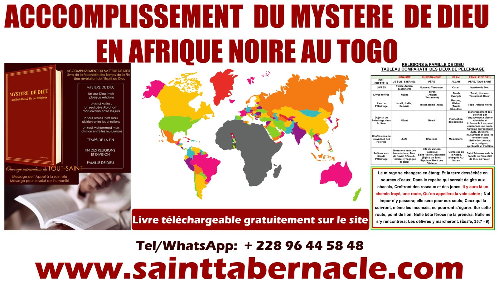 Venez découvrir ce Mystère qui conformément aux prédictions, s’est dévoilé dans ces temps de la fin en Afrique noire au Togo . C’est le temps de l’élévation divine de la race noire. Ce Mystère de Dieu qui s’accomplit dans les contextes actuels de la Thora, de la Bible et du Coran sans modifications ni retranchements des saintes écritures, est bien une connaissance au-delà de l’intelligence humaine et de toute connaissance idéologique, philosophique et théologique.