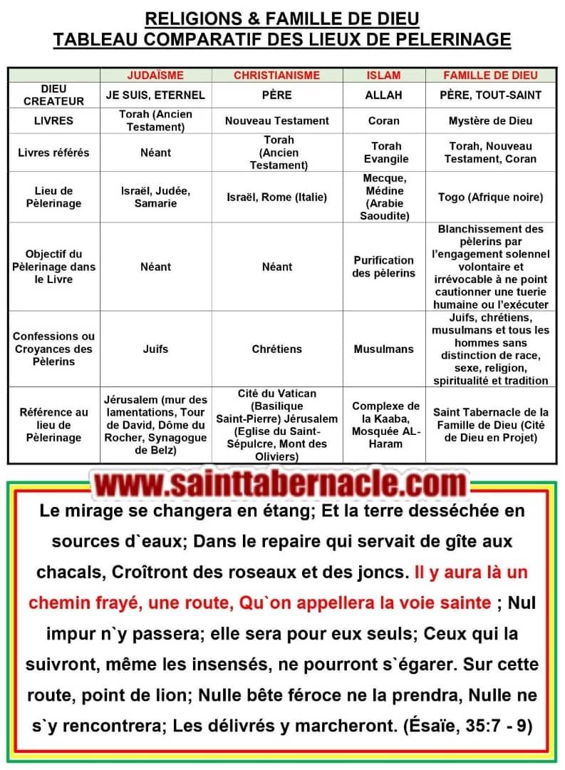 À la différence des pèlerinages se déroulant ailleurs dans le monde, celui du SAINT TABERNACLE de la cité de Dieu au Togo sera l’unique glorieux pèlerinage distingué par l’engagement solennel, volontaire et irrévocable à ne point cautionner une tuerie ou l’exécuter. Les pèlerins entreront dans la grâce des temps de la fin quelques soient leurs antécédents et leurs noms seront inscrits dans le livre de souvenir du SAINT TABERNACLE.